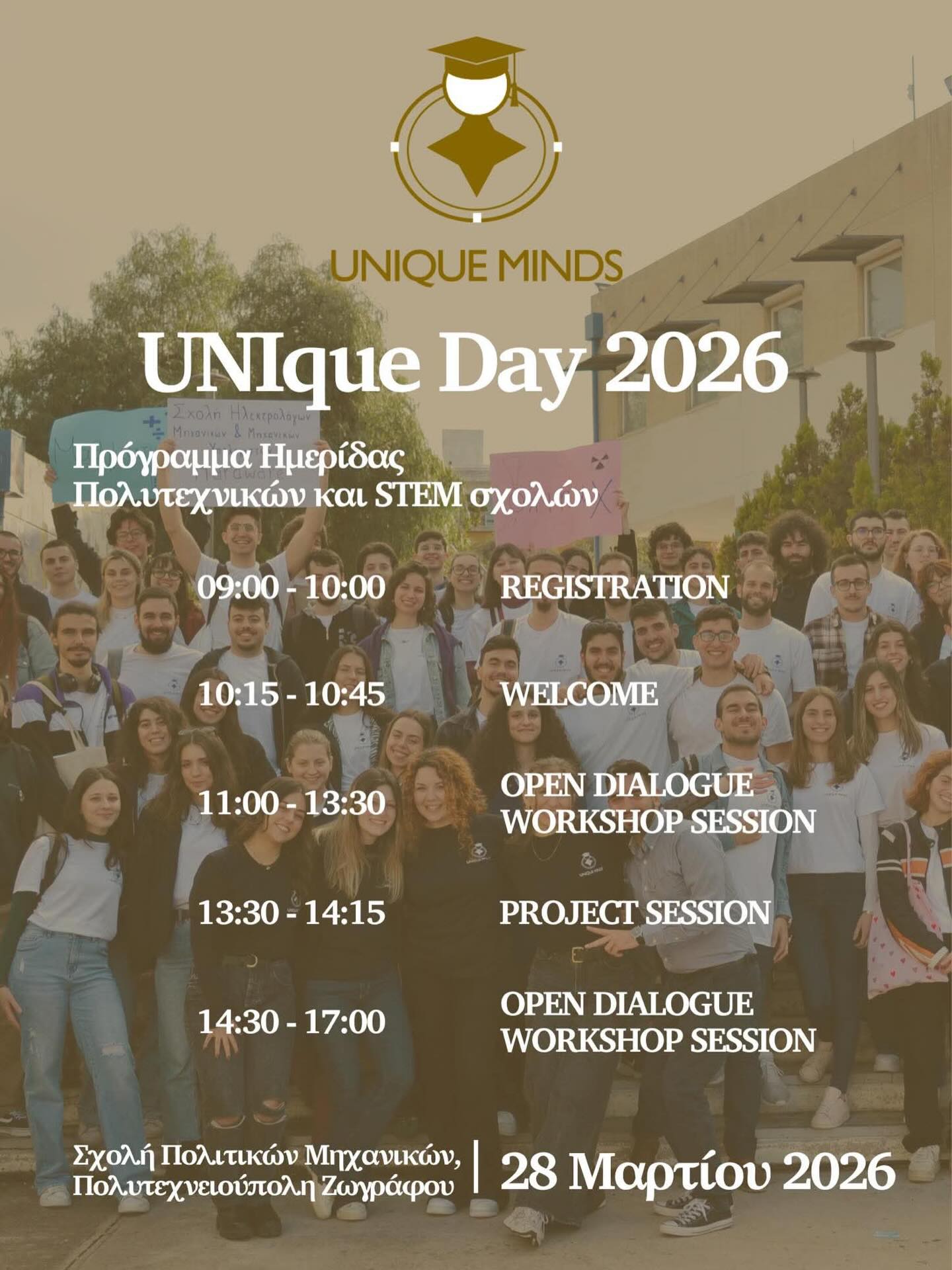 Φέτος και για 10η χρονιά θα πραγματοποιηθεί η UNIque Day για το Εθνικό Μετσόβιο Πολυτεχνείο. Πιο συγκεκριμένα στις 28/3/26 στην Πολυτεχνειούπολη της Ζωγράφου, οι μαθητές θα μπορέσουν να γνωρίσουν όλες τις Πολυτεχνικές σχολές, καθώς και τις σχολές Θετικών Επιστημών.